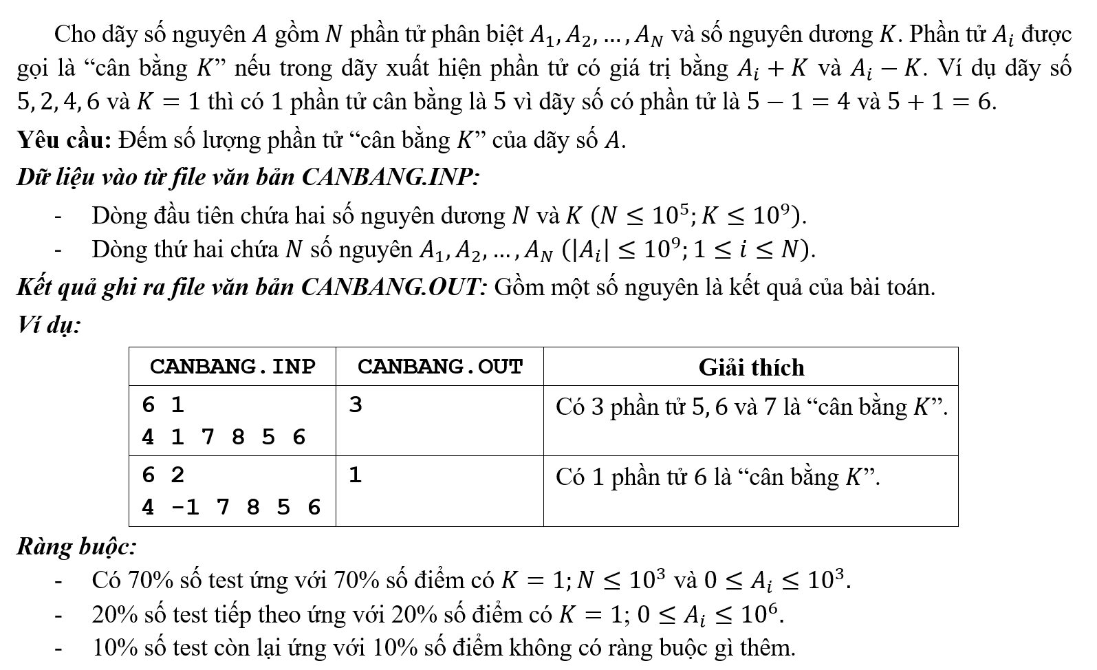 Điểm: 100 (p) Thời gian: 1.0s Bộ nhớ: 1G Input: CANBANG.INP Output: CANBANG.OUT