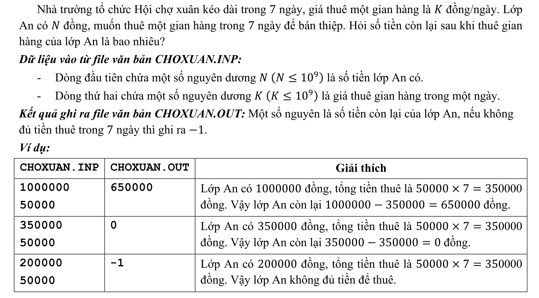 Điểm: 100 (p) Thời gian: 1.0s Bộ nhớ: 1G Input: CHOXUAN.INP Output: CHOXUAN.OUT